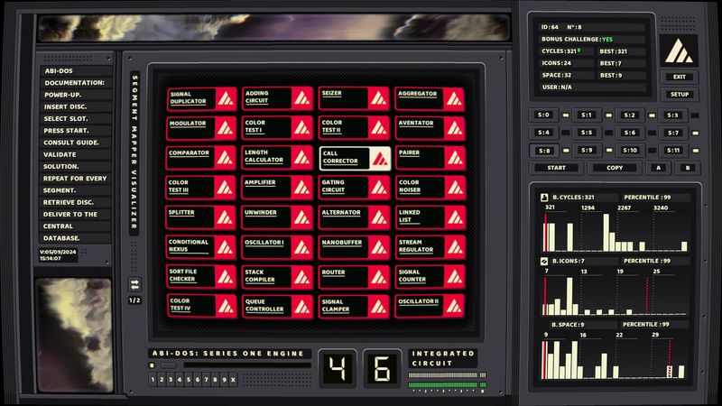 Trong ABI-DOS, bạn xây dựng mạch để thao tác và hướng dẫn UBITS (khối kỹ thuật số màu) hướng tới các mục tiêu cụ thể dựa trên tài liệu được cung cấp. Bằng cách đặt dây và khối hướng dẫn một cách chiến lược trên một vi mạch, bạn thao tác các đầu vào để đạt được đầu ra mong muốn—cho dù đó là sửa các tệp bị hỏng, khôi phục hình ảnh .png bị hỏng hay mô phỏng quỹ đạo của các hạt. ABI-DOS thách thức bạn đáp ứng các thông số kỹ thuật nghiêm ngặt thông qua việc giải quyết vấn đề sáng tạo.