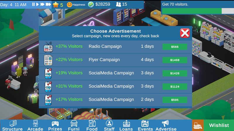 Xây dựng và quản lý Arcade trong mơ của bạn. Mở khóa nhiều trò chơi hoạt hình hoàn chỉnh, thiết lập giải độc đắc và xây dựng các khu vực giải thưởng. Bắt đầu với một tiệm trò chơi điện tử địa phương khiêm tốn và mở rộng thành một trung tâm giải trí trò chơi điện tử lớn! Mở khóa các bản mod Legend để thay đổi luật chơi và chiến lược của trò chơi.