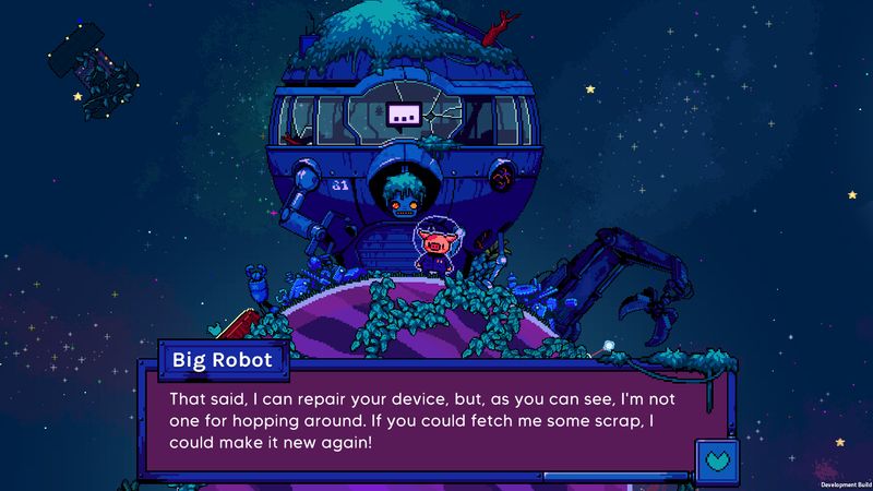 Một trò chơi nền tảng giải đố phiêu lưu lo-fi lấy cảm hứng từ thập niên 90 về một phi hành gia heo con và con tàu thông minh của anh ta.