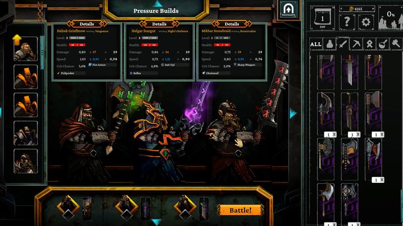 Trong các cuộc thám hiểm, bạn sẽ thu thập được những chiến lợi phẩm giá trị như vàng và quặng kim loại, đồng thời nhận được phần thưởng đặc biệt, bao gồm cả các mẫu vũ khí mới. Hãy sử dụng chúng để mở rộng và phát triển lò rèn, mua nguyên liệu mới trong cửa hàng, chế tạo thêm nhiều loại vũ khí đa dạng hơn và hoàn thiện kỹ năng rèn của bạn! Bạn cũng có thể thử thách tay nghề của mình trong các thử thách rèn hàng ngày, đòi hỏi sự tỉ mỉ đến từng chi tiết. Hoàn thành chúng để nhận vàng và tài nguyên quý giá. Hãy nhớ rằng, thợ rèn càng giỏi, cơ hội chiến thắng của đội bạn càng cao!
