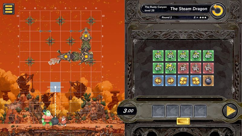 Mỗi màn chơi sẽ cung cấp cho bạn một bộ ô Hành động có thể được ghép vào một chuỗi. Độ dài của chuỗi này sẽ khác nhau tùy theo từng câu đố và diễn ra từ trái sang phải. Các hành động bao gồm: Di chuyển để di chuyển sang trái và phải, Thuốc để tăng hoặc giảm sức mạnh của khẩu pháo, một kho thuốc nổ và các hành động Tiện ích như Chờ và Vòng lặp.