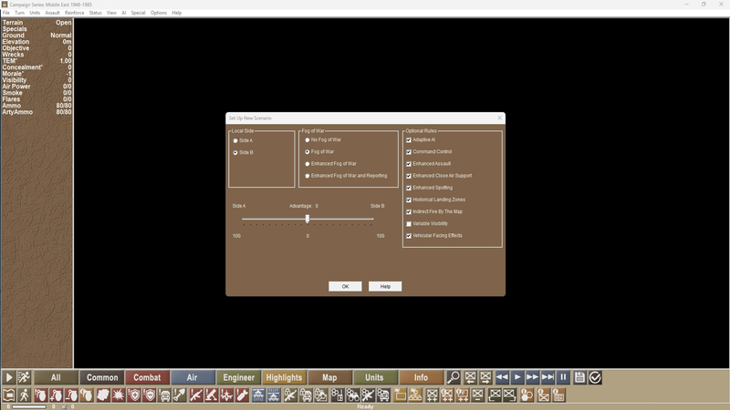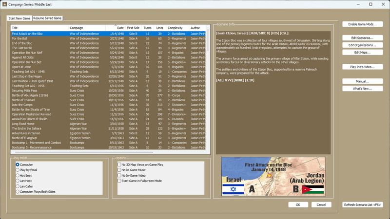 Trò chơi bao gồm một bộ đầy đủ các trình chỉnh sửa kịch bản và Order of Battle, cùng với một thư viện đồ sộ các bản đồ chính và Order of Battle lịch sử từ năm 1948-1985. Các bản cập nhật trong tương lai sẽ mở rộng các cuộc xung đột và giới thiệu thêm các kịch bản giả định.