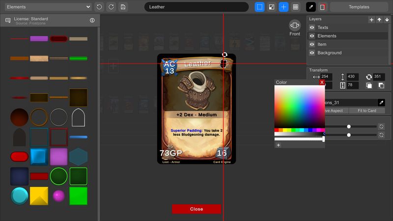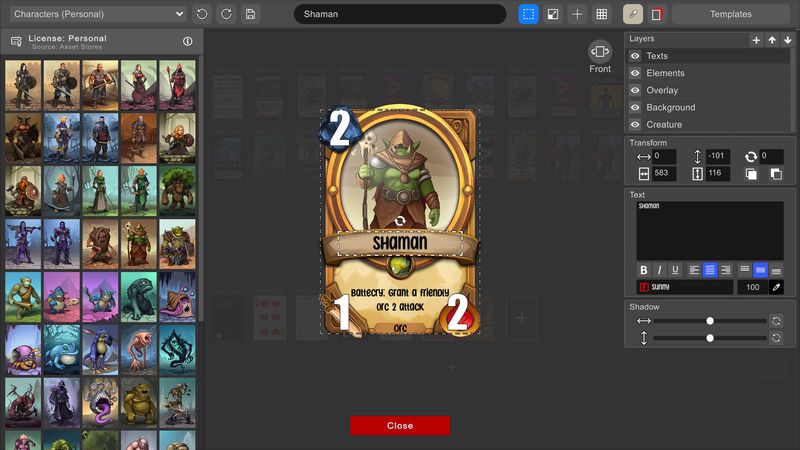 Cho dù bạn là nhà thiết kế trò chơi dày dạn kinh nghiệm hay người mới chơi, Card Engine đều cung cấp các công cụ để dễ dàng tạo ra những tấm thẻ tuyệt đẹp. Không yêu cầu kỹ năng vẽ. Tùy chỉnh các mẫu, nhập nội dung của riêng bạn hoặc chạm vào thư viện rộng lớn gồm các nội dung tích hợp sẵn. Quản lý thẻ của bạn một cách liền mạch và xuất chúng dưới dạng tệp hình ảnh để sử dụng kỹ thuật số hoặc in cho thẻ vật lý. Giải phóng khả năng sáng tạo của bạn và biến tầm nhìn về trò chơi bài của bạn thành hiện thực với Card Engine.