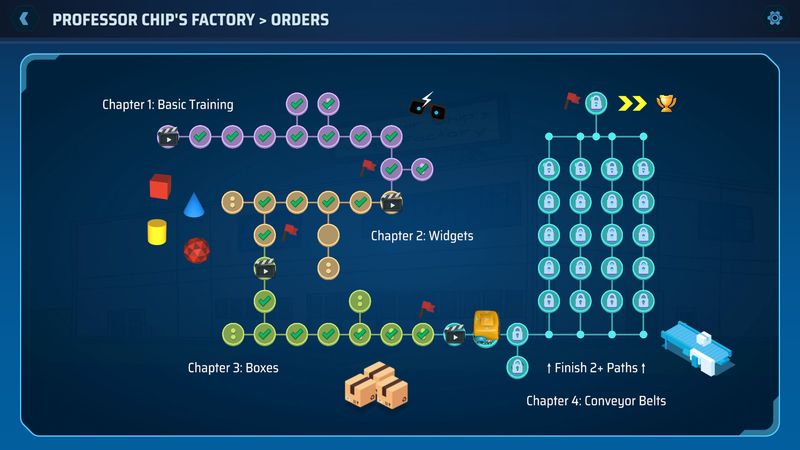 Hãy điều khiển một chú robot khiêm tốn, ChipWit Model CW-03.24, và học cách tự động hóa các hoạt động của nó. Đặt các chip để hướng dẫn ChipWit di chuyển trên sàn nhà máy, dựa trên các kỹ năng đã học ở các khu vực trước đó để giải các câu đố ngày càng phức tạp hơn, giúp Giáo sư Chip mở nhà máy đầu tiên của mình. Hãy đặt những chip này để tìm lời giải cho mỗi tầng, sau đó nhấn nút phát để xem ChipWit của bạn hoàn thành mục tiêu!