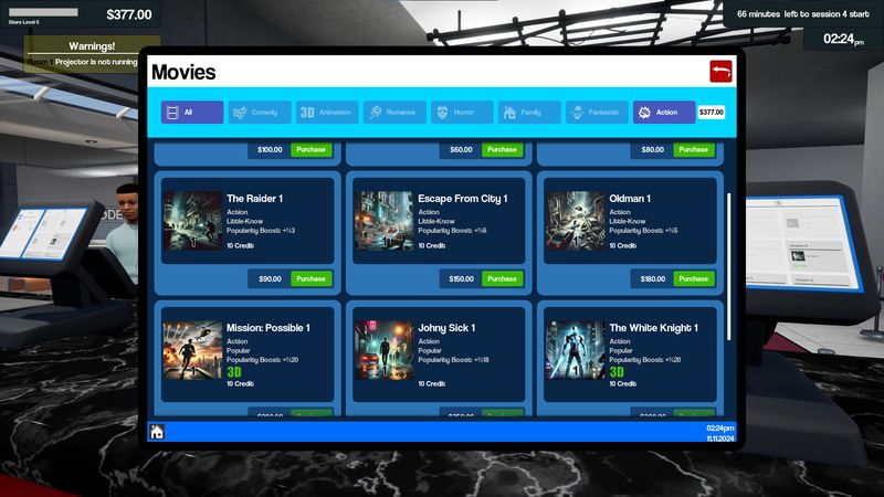 Tự quản lý rạp chiếu phim của bạn! Đặt giờ chiếu, in vé, mua phim mới, làm bỏng ngô, nâng cấp và vệ sinh rạp. Máy bán hàng tự động, nhân viên, nâng cấp và nhiều thứ khác nữa sẽ sớm ra mắt!