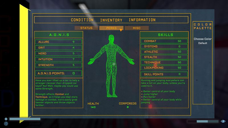 - Một hệ thống Kỹ năng và A.G.N.I.S. (Sự quyến rũ, Sự gan dạ, Sự mọt sách, Trực giác, Sức mạnh). Đặt các vật thể vào thế giới để đến các địa điểm hoặc trèo qua hàng rào, tạo ra con đường của riêng bạn. Cửa bị khóa? Hãy hack nó. Hoặc mở khóa nó. Phá hủy nó. Hoặc thay vào đó, quyến rũ hoặc thuyết phục một người bảo vệ mở cửa cho bạn