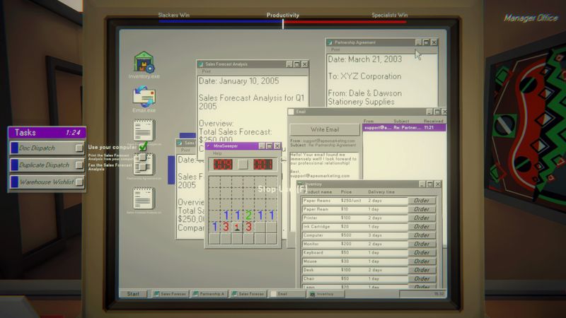 Trong “Dale & Dawson Stationery Supplies”, hãy vào vai Quản lý, Chuyên gia hoặc Kẻ lười biếng trong môi trường văn phòng. Kẻ lười biếng hòa nhập, bắt chước Chuyên gia để tránh sự nghi ngờ của Quản lý. Phát hiện hoặc khiến sự lừa dối giành chiến thắng.
