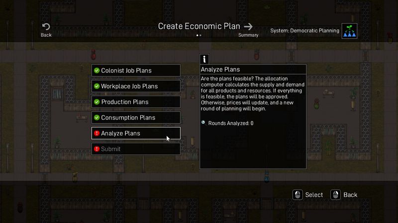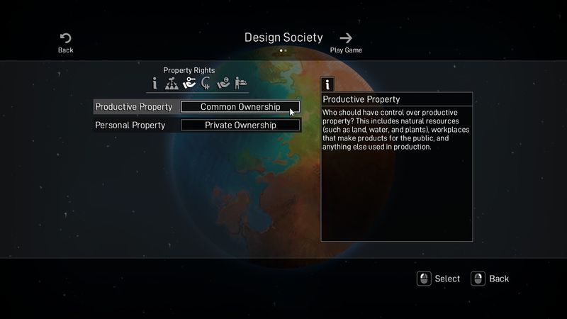 Kết hợp và kết hợp các bộ quy tắc khác nhau để thay đổi đáng kể cảm giác về cuộc sống trong thuộc địa của bạn. Sau khi đưa ra quyết định (chẳng hạn như ai có thể kiểm soát tài nguyên, cách người thực dân nhận được thu nhập và ai có quyền ra quyết định), bạn sẽ thấy tác động của chúng đối với mọi người.
