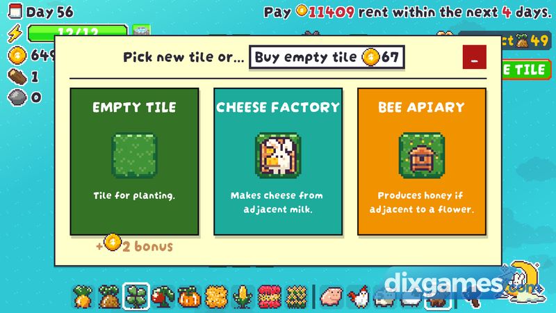 Nhận các lựa chọn ô ngẫu nhiên không thể đoán trước khi bạn mở rộng trang trại của mình. Mỗi ô mới mang đến cơ hội thay đổi chiến lược của bạn.