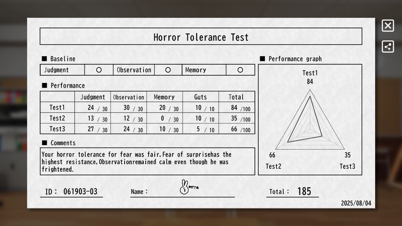 • Một “bài kiểm tra năng lực” được tiến hành trước để đánh giá “khả năng phán đoán”, “trí nhớ” và “khả năng quan sát”. Độ khó của trò chơi tăng dần theo kết quả.