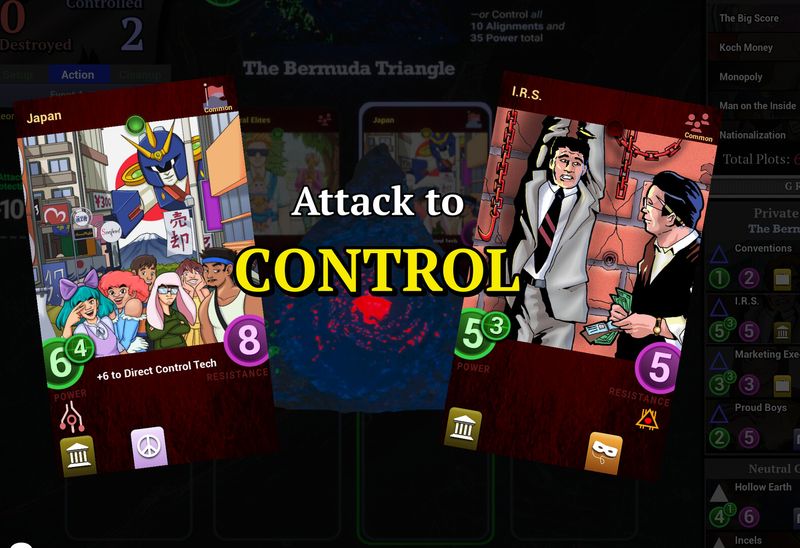 Chọn từ 6 âm mưu bí mật khác nhau, mỗi âm mưu có sức mạnh, khả năng và cách thức chiến thắng khác nhau. Một số được thúc đẩy bởi quyền lực thô sơ hoặc tiền bạc. Một số chỉ muốn thế giới trở nên kỳ lạ hơn… trong khi số khác chỉ muốn thiêu rụi tất cả. Mỗi Illuminati đều có thiết kế độc đáo, bao gồm âm nhạc, hiệu ứng và hình ảnh tùy chỉnh.
