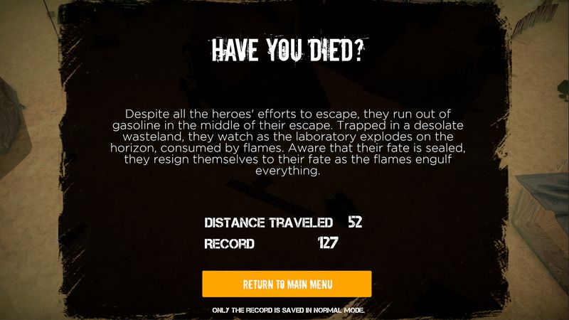 Trong trò chơi này, bạn sẽ phải khám phá thế giới để tìm xăng cho chiếc xe của mình trong khi chạy trốn khỏi thây ma và khủng long phun lửa.