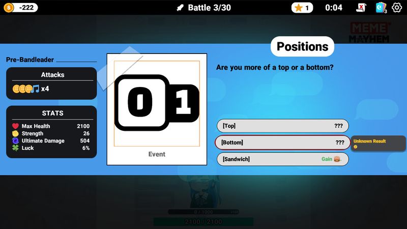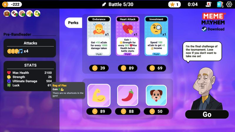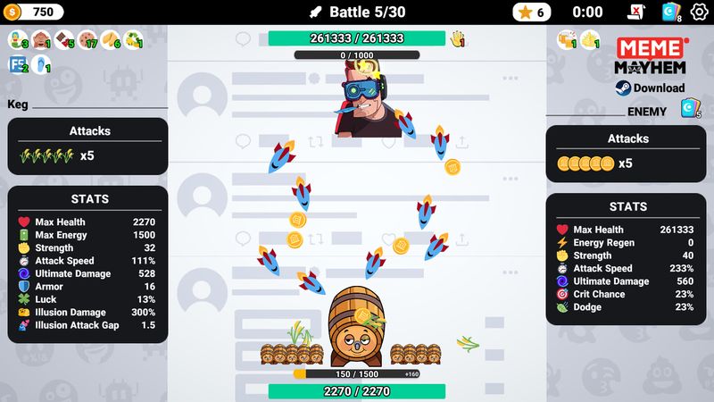 Các trò chơi roguelite của bạn không có đủ meme? Bạn muốn chiến đấu với kẻ thù truyền thông xã hội của mình trong các trận chiến biểu tượng cảm xúc nghẹt thở? Đăng nhập vào thế giới của Meme Mayhem. Cuộn nguồn cấp dữ liệu trong trò chơi, phản ứng với các bài đăng và chọn chiến đấu với những người nổi tiếng. Trượt vào DM của các nhân vật như Pop Kat, Mars và Sad Tadpole. Cho dù bạn là người theo chủ nghĩa lý tưởng vị tha hay chỉ tìm kiếm sự giàu có và danh tiếng, bạn đang trên đường vươn lên vị trí hàng đầu trong chuỗi thức ăn truyền thông xã hội.