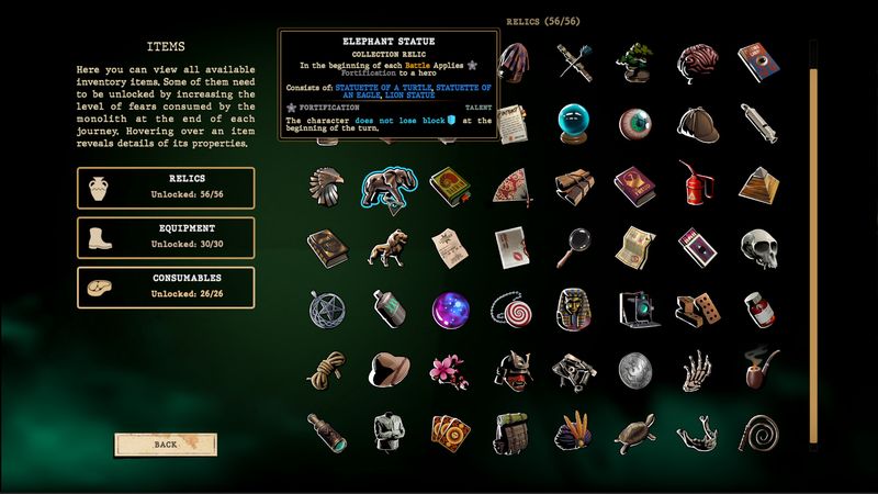 - 3 loại vật phẩm trong kho: Di vật, Thiết bị, Vật phẩm tiêu hao. Hầu hết các di vật có thể được lắp ráp thành các bộ sưu tập mạnh mẽ