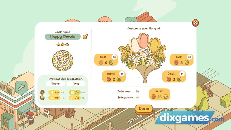 Thu hút khách hàng bằng mọi thứ, từ bó hoa đến hát karaoke! Các cửa hàng bạn tạo sẽ cần sự hướng dẫn cẩn thận của bạn để cung cấp đúng sản phẩm với mức giá phù hợp. Dẫn họ đến thành công và làm cho khu phố của bạn phát triển mạnh mẽ.