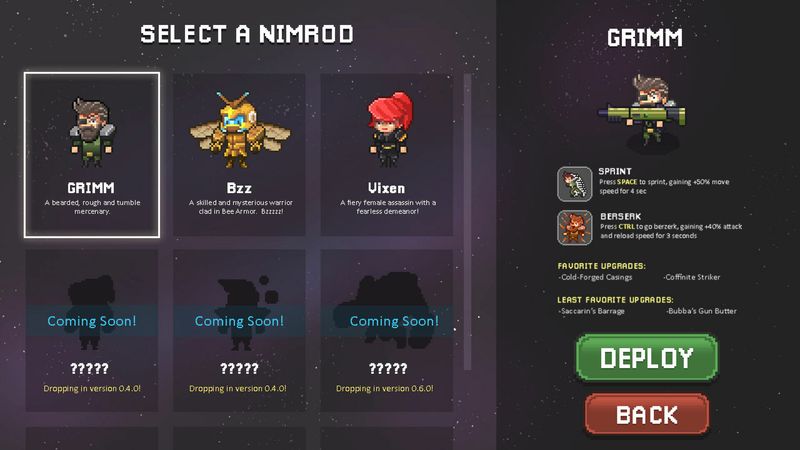 Trong một thế giới ngoài hành tinh rộng lớn và khắc nghiệt, bạn chỉ là một con cờ. Bạn được nhân bản từ ADN với một mục đích duy nhất: thử nghiệm những vũ khí tàn phá, quá khích và hoàn toàn vô lý nhất mà dải ngân hà từng biết đến. Chào mừng đến với NIMRODS, tựa game bắn súng sinh tồn roguelite tối thượng nơi mà vũ khí bạn chế tạo là di sản bạn để lại.