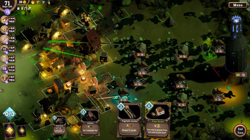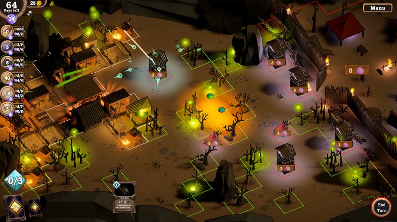 Tại mỗi công sự của kẻ thù, bạn sẽ xây dựng thị trấn của mình từ những lá bài mà bạn đã thu thập được, trong đó mỗi lượt là một ngày bị mất. Mỗi thị trấn sẽ bắt đầu từ một khởi đầu khiêm tốn, nhưng trong thời gian ngắn, bạn sẽ xây dựng một thành phố công nghiệp sản xuất đủ loại tài nguyên độc đáo.