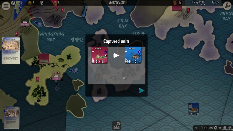 • Người chơi Triều Tiên trước tiên phải tuyệt vọng chống lại cuộc xâm lược ban đầu và quân địch đông đảo hơn, chờ đợi quân tiếp viện của Trung Quốc, trông cậy vào cuộc nổi loạn của địa phương và trên hết là lực lượng hải quân hùng mạnh của mình để thay đổi tiến trình của các sự kiện.