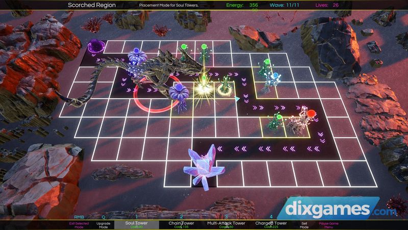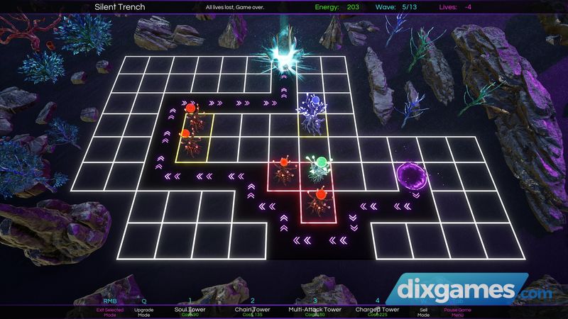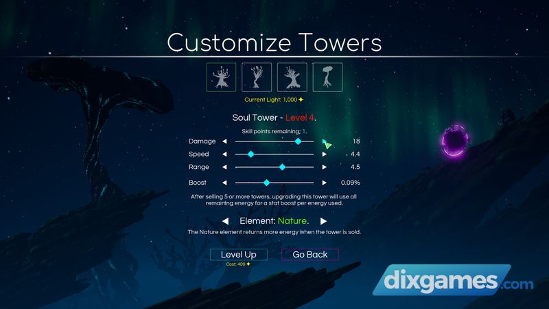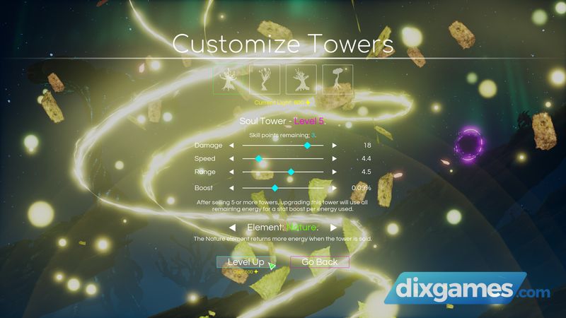 Phân phối điểm kỹ năng giữa các chỉ số cơ bản và kỹ năng tháp độc đáo. Sau đó, chọn một yếu tố cho tháp sẽ tạo ra các hiệu ứng bổ sung như đạn điện làm chậm băng giá hoặc nhanh hơn.