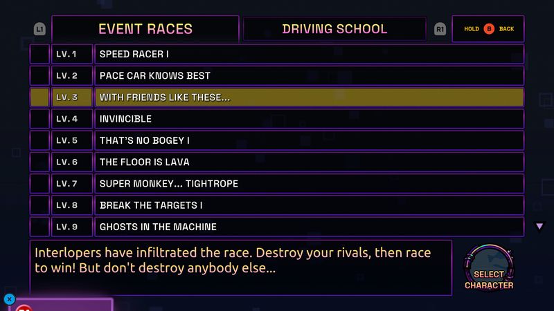 Cuộc đua không dừng lại ở đó. Các cuộc đua Sự kiện là một biến thể hoang dã của đua xe truyền thống, nơi luật lệ thay đổi liên tục. Sống sót qua các đường đua ngập tràn dung nham, né tránh những kẻ xâm nhập bí ẩn, hoặc vượt qua các thử thách “phá vỡ mục tiêu” dựa trên độ chính xác.