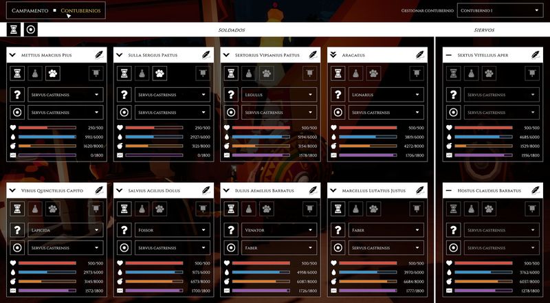 - Quản lý – Tổ chức ca làm việc giữa binh lính và nô lệ, lên lịch cho lính canh và theo dõi tinh thần của quân lính.