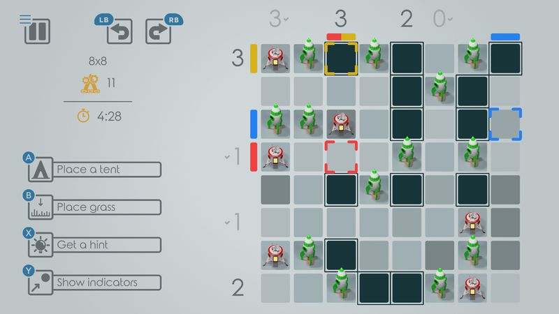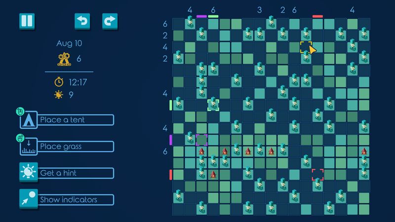 Các con số xung quanh lưới cho bạn biết số lượng lều phải được đặt trong mỗi hàng và cột, nhưng hãy cẩn thận: các lều không thể chạm vào nhau. Mỗi cấp độ chỉ có một giải pháp duy nhất, vì vậy hãy dành thời gian và lên kế hoạch cẩn thận cho mọi bước đi của bạn.