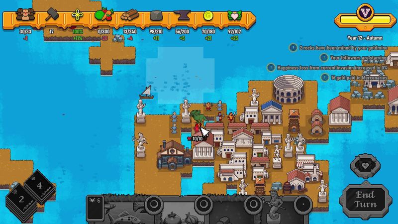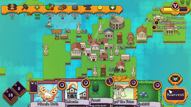 Thu thập thẻ bài để nâng đất từ biển, xây dựng khu định cư và mưa lửa xuống những kẻ xâm lược trong trò chơi xây dựng thành phố sinh tồn này với cơ chế xây dựng bộ bài theo phong cách roguelike. Chọn từ 4 vị thần với các thẻ bài, phong cách chơi và khả năng độc đáo để dẫn dắt nền văn minh của họ đến chiến thắng trong lối chơi chiến lược theo lượt chạy!