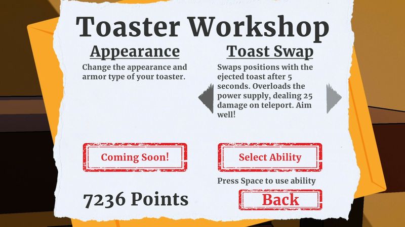 Bạn là một Toaster. Bạn được giao nhiệm vụ loại bỏ mục tiêu bằng cách khéo léo điều khiển vào bồn tắm của chúng. Sử dụng khả năng dây nguồn và nướng bánh mì của bạn để làm chậm thời gian, vật lộn và xoay quanh các môi trường dựa trên vật lý để thực hiện Toastercide, tất cả trong khi điều hướng nhanh nhất có thể.
