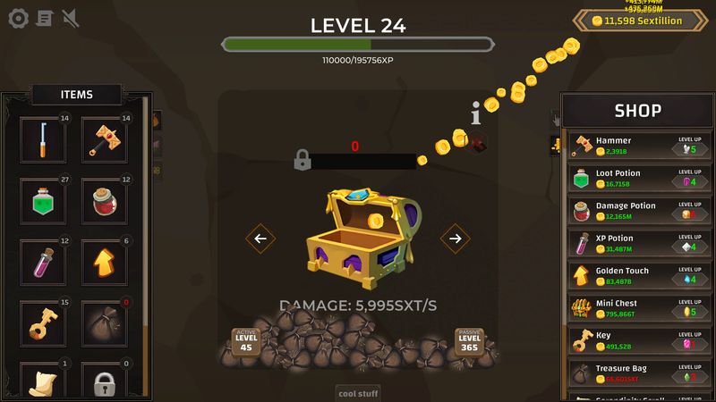 Nhấp chuột để kiếm kho báu! Trong trò chơi nhấp chuột nhàn rỗi cổ điển này, các cú nhấp chuột của bạn sẽ bắt đầu yếu, nhưng khi bạn tiến triển, sức mạnh nhấp chuột của bạn sẽ tăng dần. Trang bị nhiều con trỏ khác nhau phù hợp với phong cách chơi của bạn. Nếu bạn thích cách tiếp cận thụ động hơn và thích chạy trò chơi ở chế độ nền, con trỏ thụ động sẽ là lựa chọn của bạn. Đối với những người thích phong cách chơi chủ động với trọng tâm là sát thương chí mạng, các con trỏ chủ động và sát thương chí mạng đều khả dụng. Tất nhiên, cũng có những con trỏ dành cho những người chơi thích sự kết hợp cân bằng của mọi thứ.