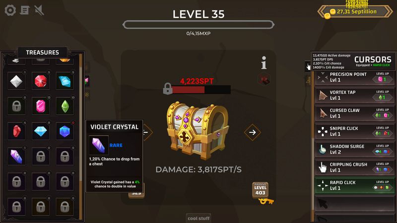 Nhấp chuột để kiếm kho báu trong Treasure Chest Clicker! Khám phá vàng, lên cấp và tìm tất cả kho báu quý hiếm ẩn bên trong rương!
