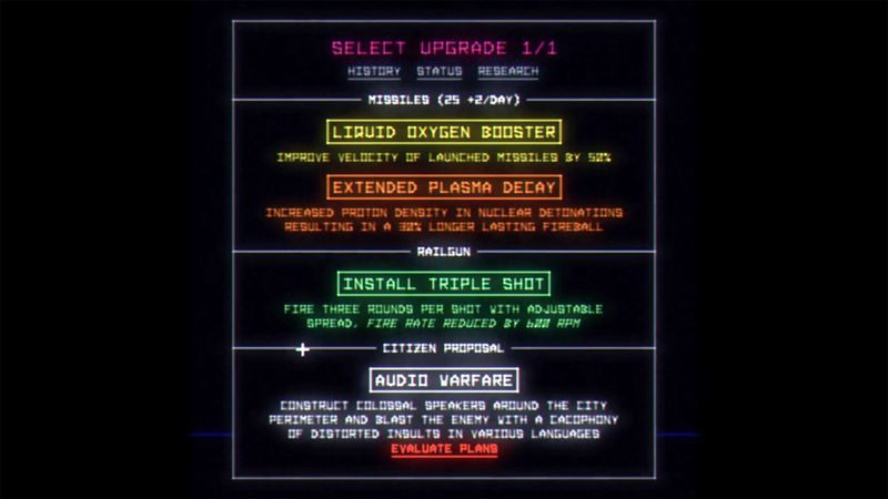 Dễ học: việc bắn diễn ra tự động, chỉ cần điều khiển tháp pháo của thành phố và thỉnh thoảng phóng đầu đạn hạt nhân phá tan bầu trời. Mỗi ngày sống sót sẽ được thưởng bằng một bản nâng cấp cho khả năng phòng thủ của bạn, hãy lựa chọn một cách khôn ngoan để giữ cho nhân loại sống sót lâu nhất có thể.