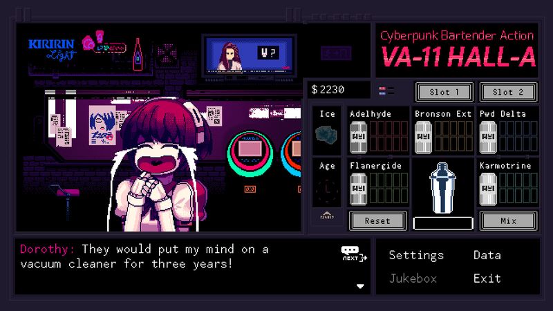 VA-11 HALL-A: Cyberpunk Bartender Action là một trò chơi về waifu, công nghệ và cuộc sống hậu phản địa đàng.