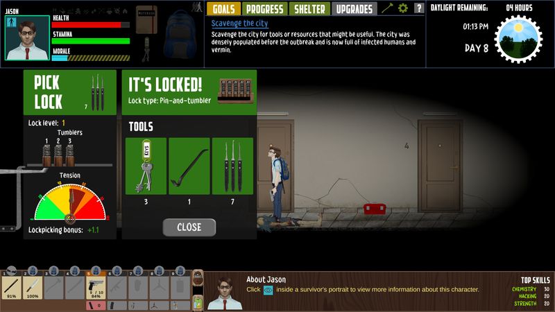 Xử lý ổ khóa theo nhiều cách. Chúng có nhiều loại và kích cỡ khác nhau, đứng chắn giữa bạn và các tài nguyên quan trọng. Nếu bạn có đúng công cụ trong ba lô, bạn có thể mở khóa, cạy hoặc cạy ổ khóa. Các hành động này được thực hiện dưới dạng trò chơi nhỏ và độ khó của nhiệm vụ sẽ phụ thuộc vào chỉ số của anh hùng. Bạn cũng có thể sử dụng chìa khóa hoặc nhập đúng mã khóa nếu tìm thấy chúng trên đường đi.
