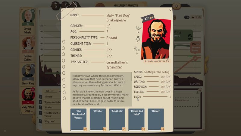 “Writer’s Rush” là một trò chơi mô phỏng nhà văn, nơi bạn phải cạnh tranh với những người sáng tạo khác. Đánh bại những người còn lại và trở thành nhà văn số 1 trên hành tinh! Có 6 cấp độ với các nhà văn khác nhau. Sau khi hoàn thành một cấp độ, bạn sẽ chuyển sang cấp độ tiếp theo. Vượt qua Wally “Mad Dog” Shakespeare và giành chiến thắng trong cuộc thi trước khi hết giờ.